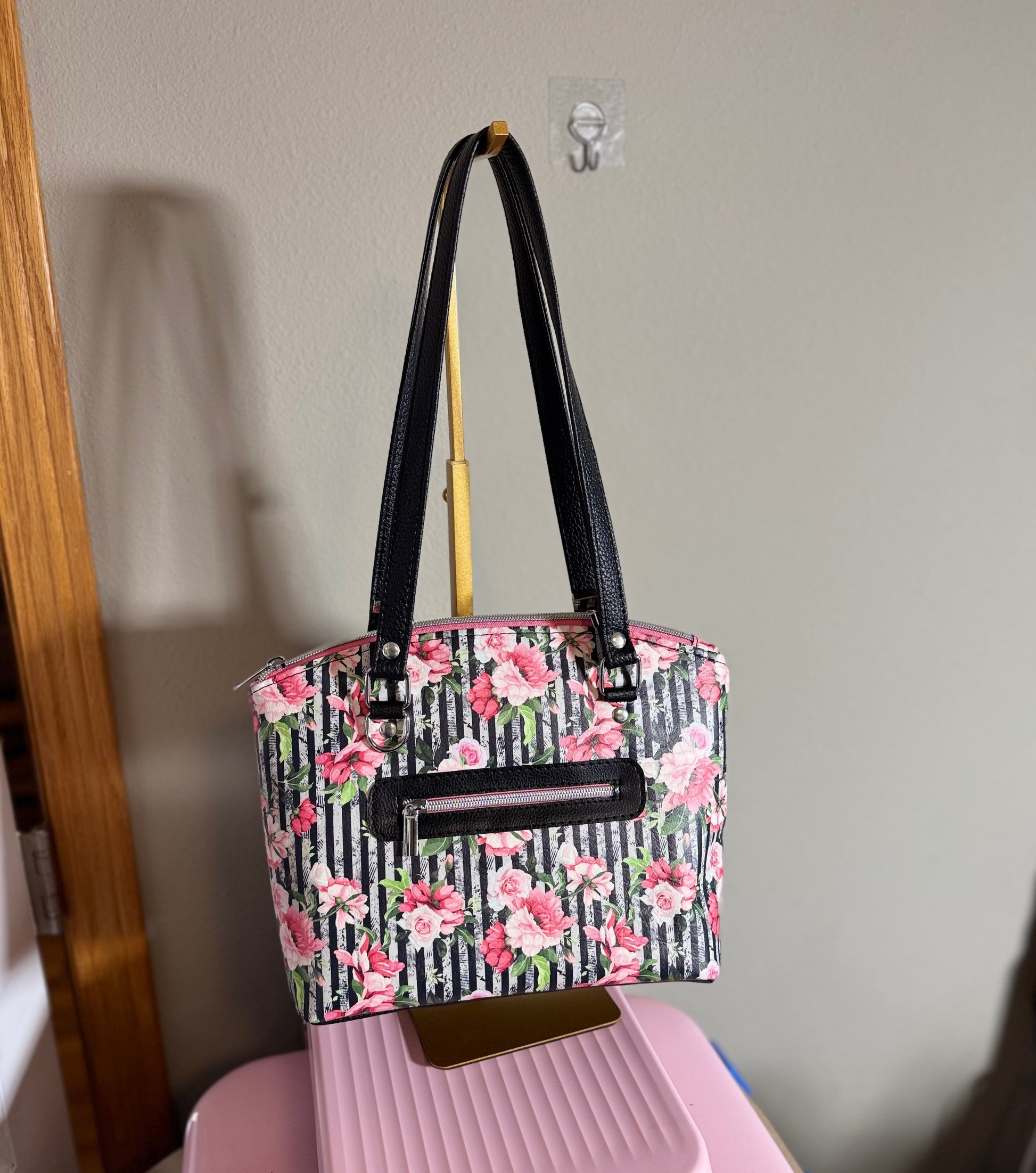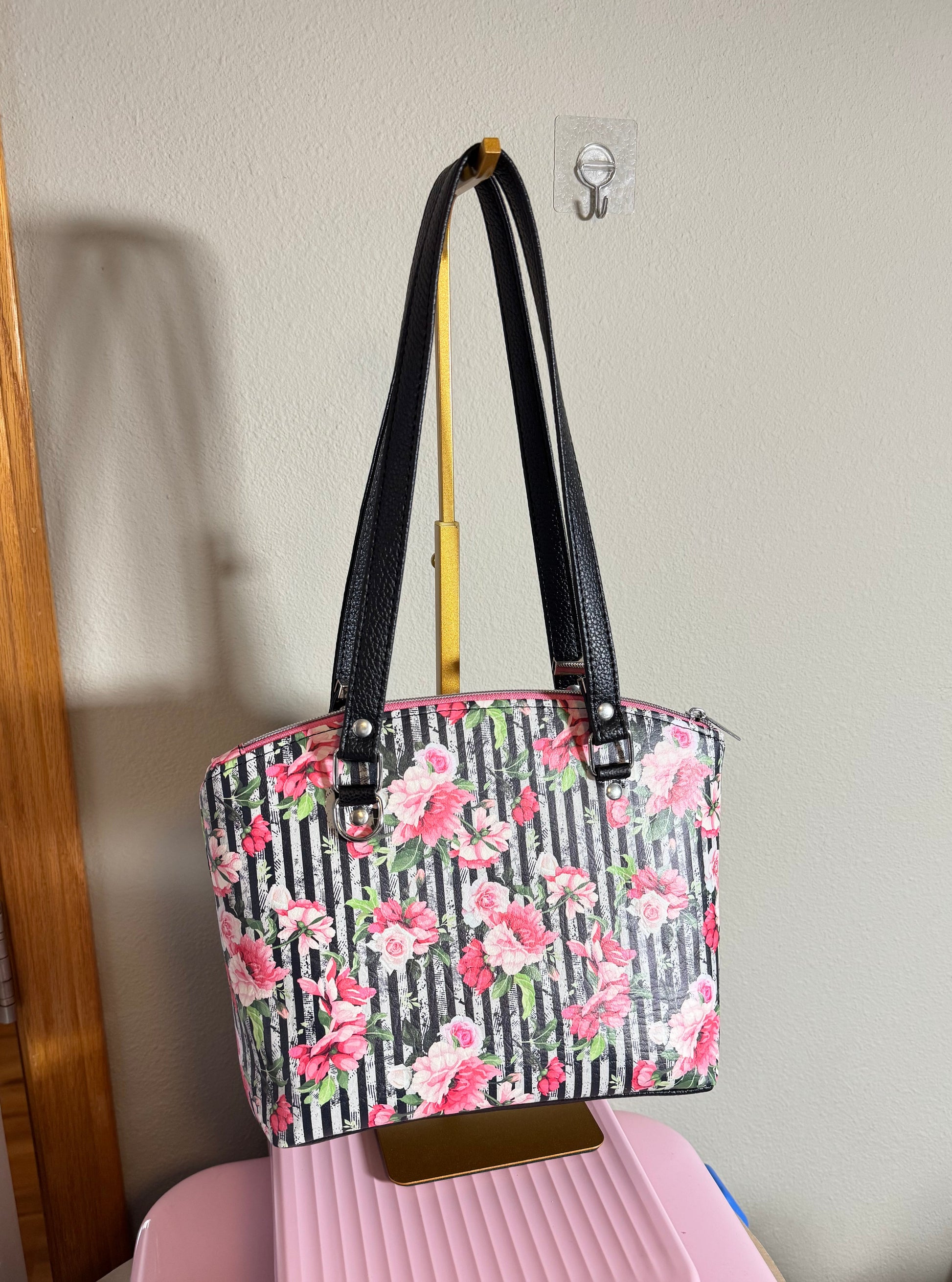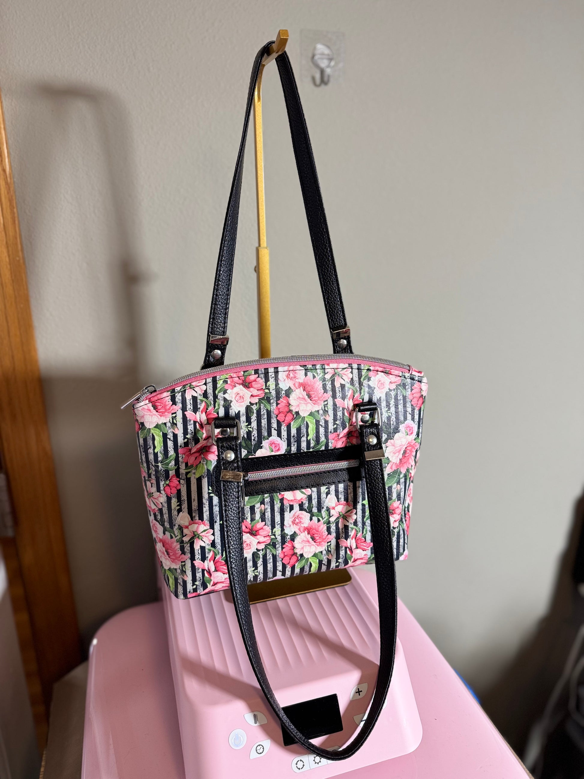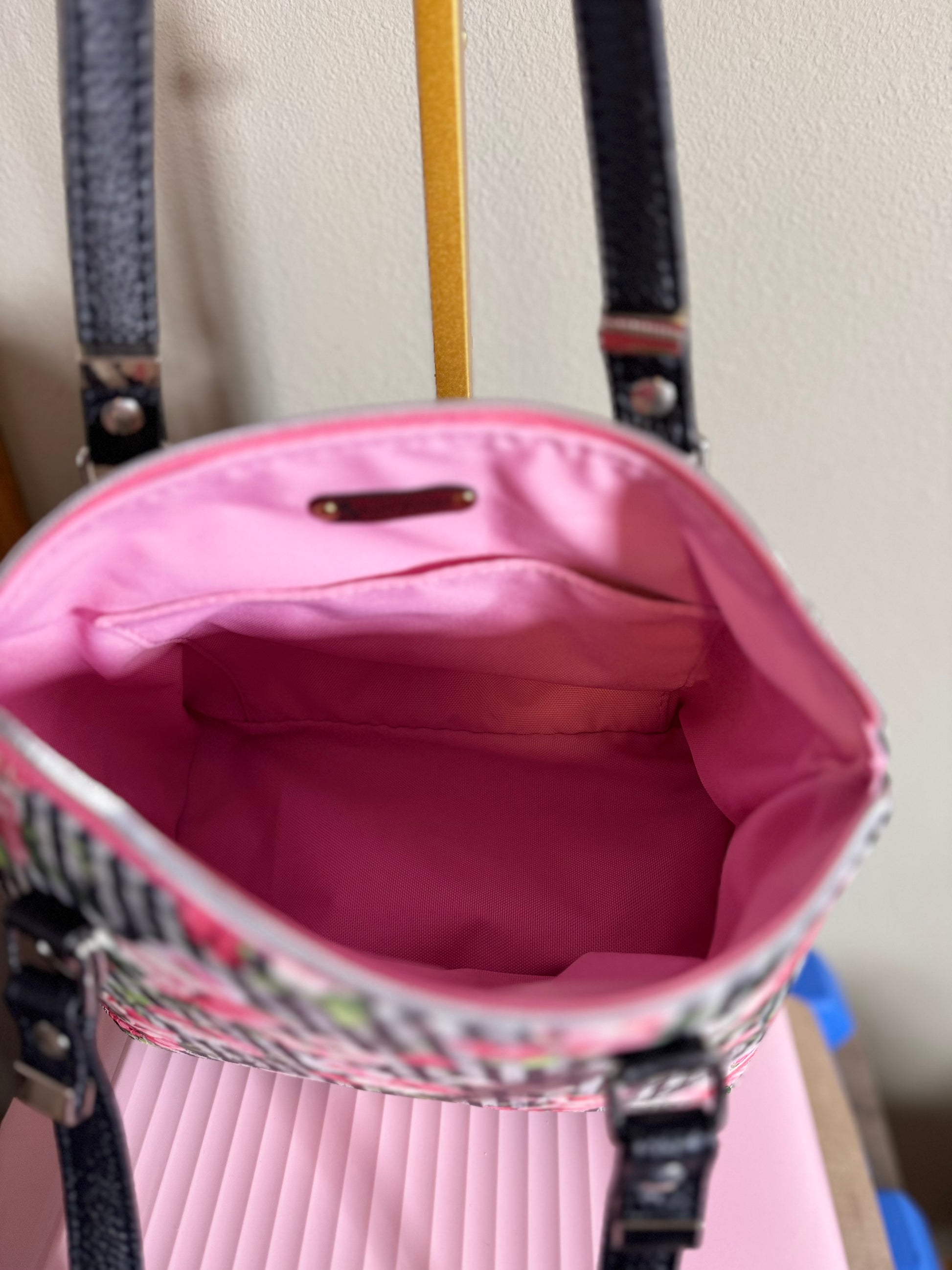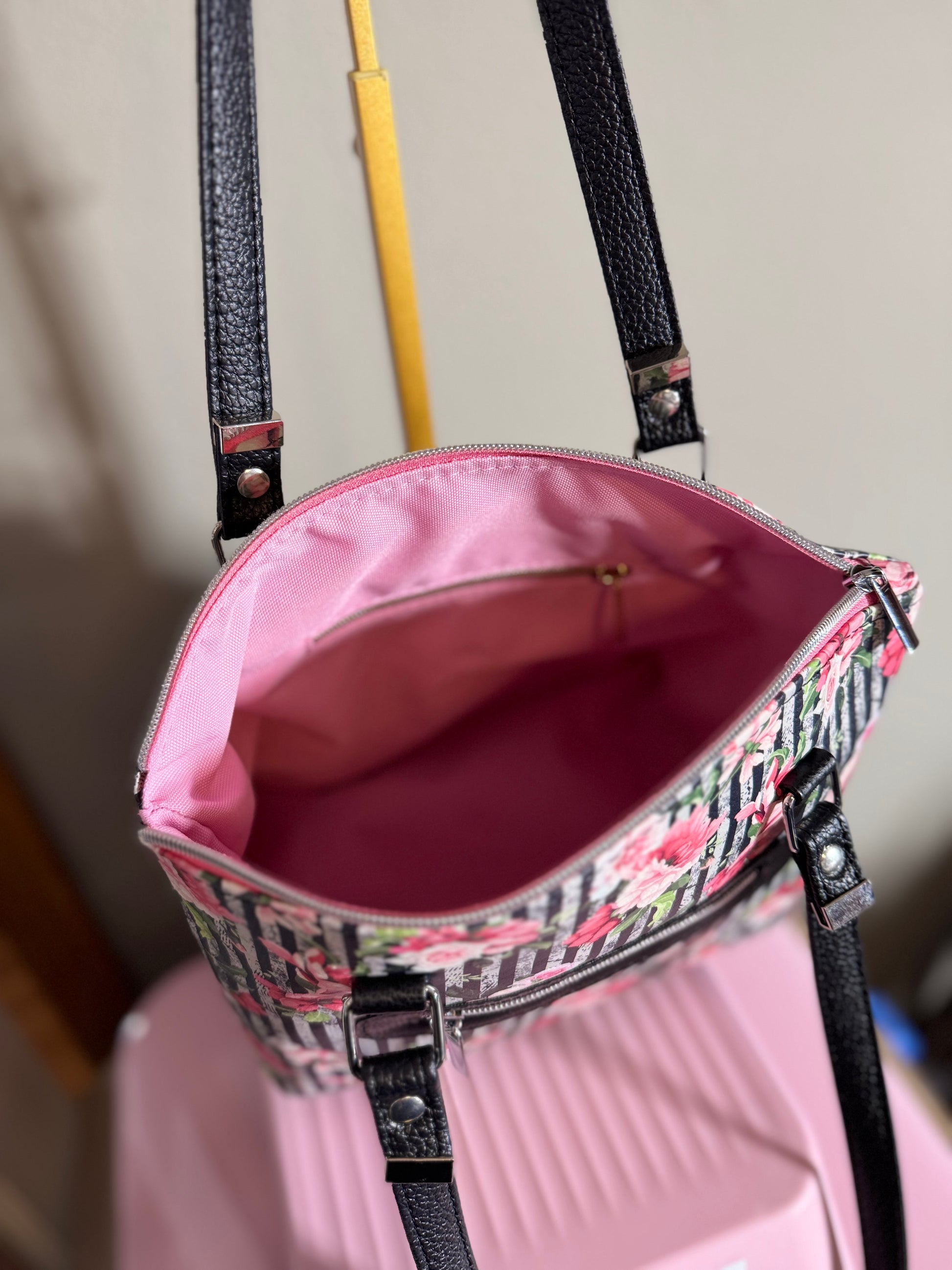 This small bag includes a trimmed zippered pocket, a zippered main compartment, an interior slip pocket and an interior zipper pocket.