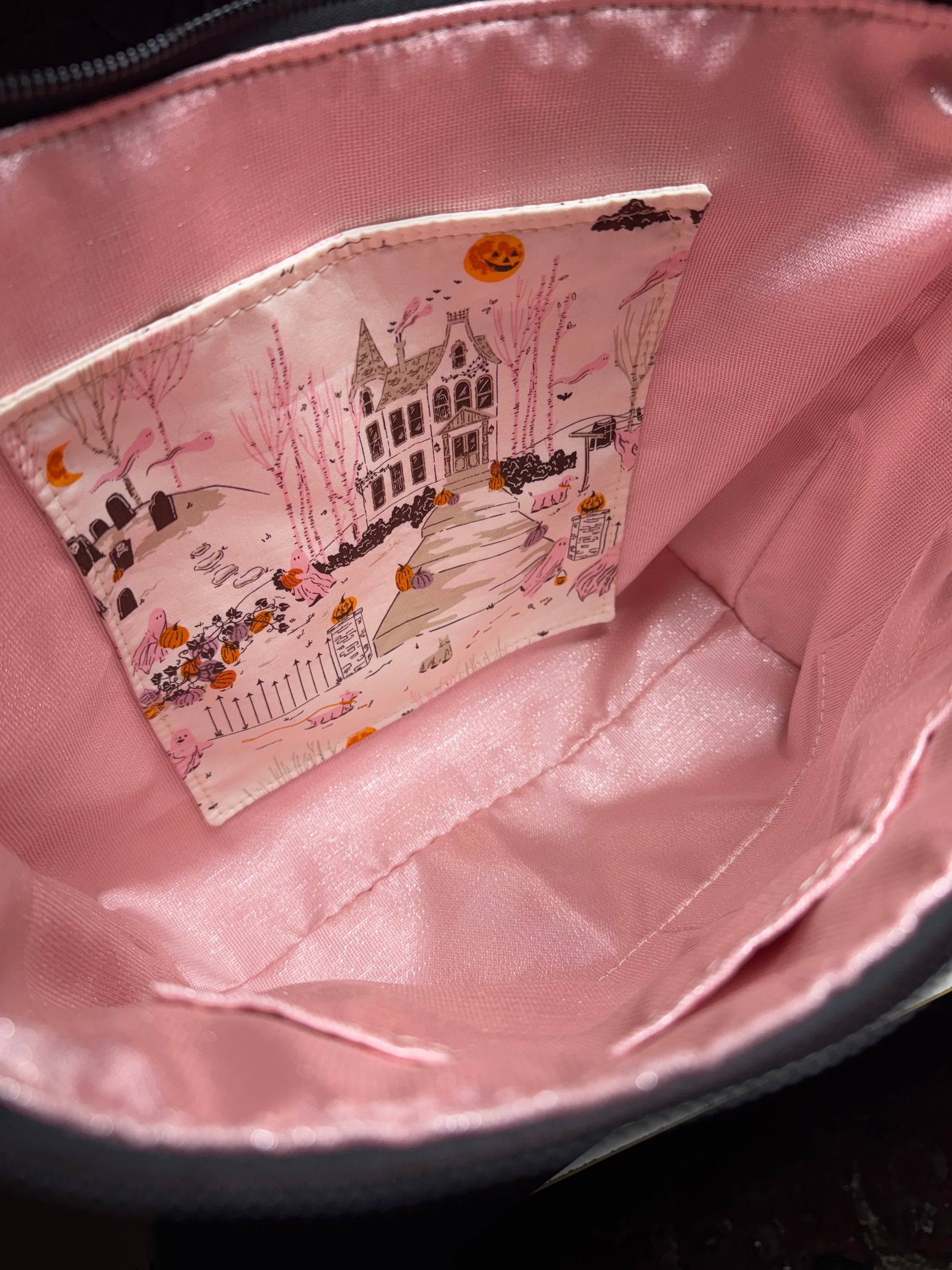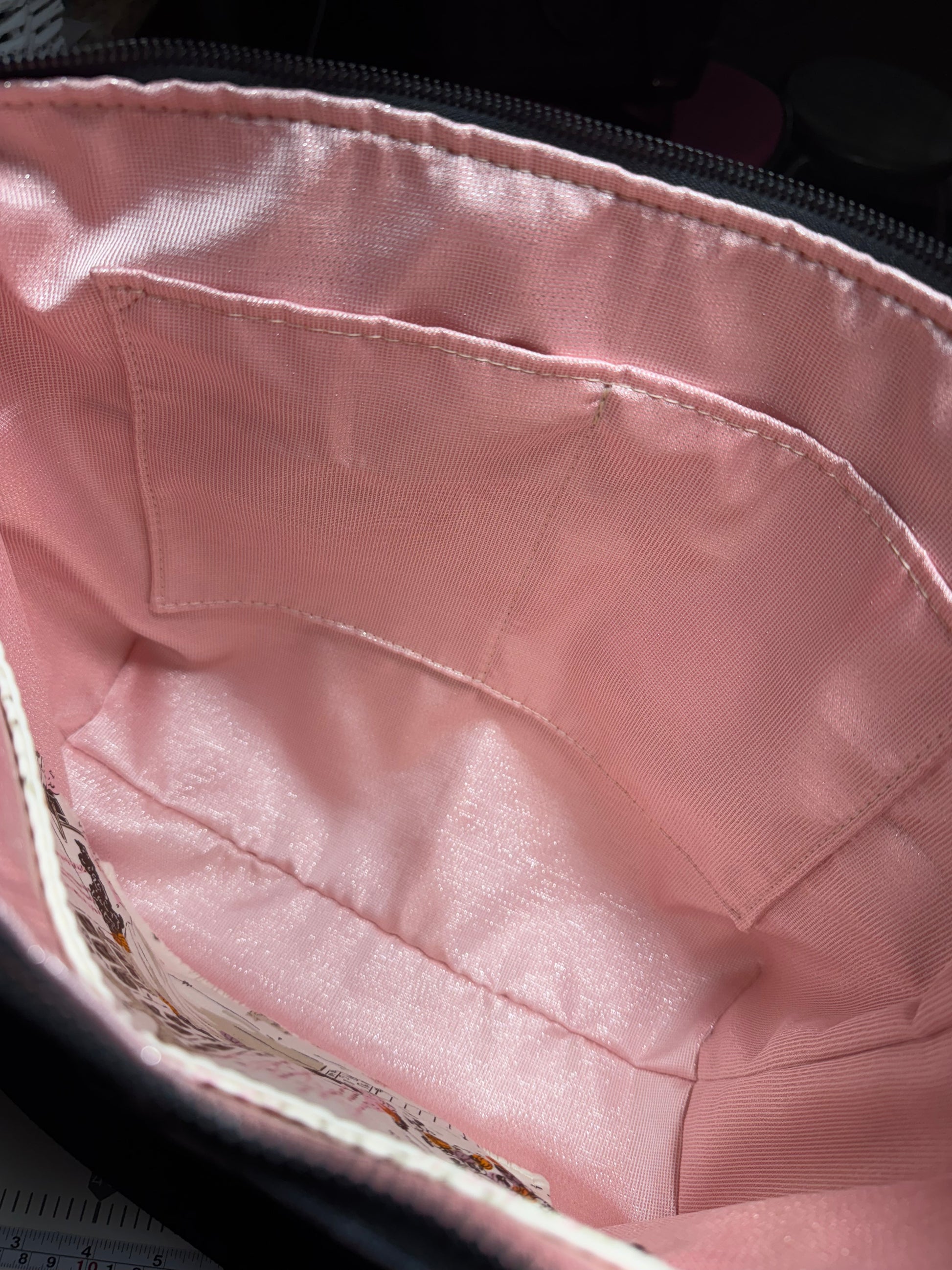 This tote has two exterior slip pockets and two interior slip pockets (one is divided). The interior lining has a touch of sparkle.