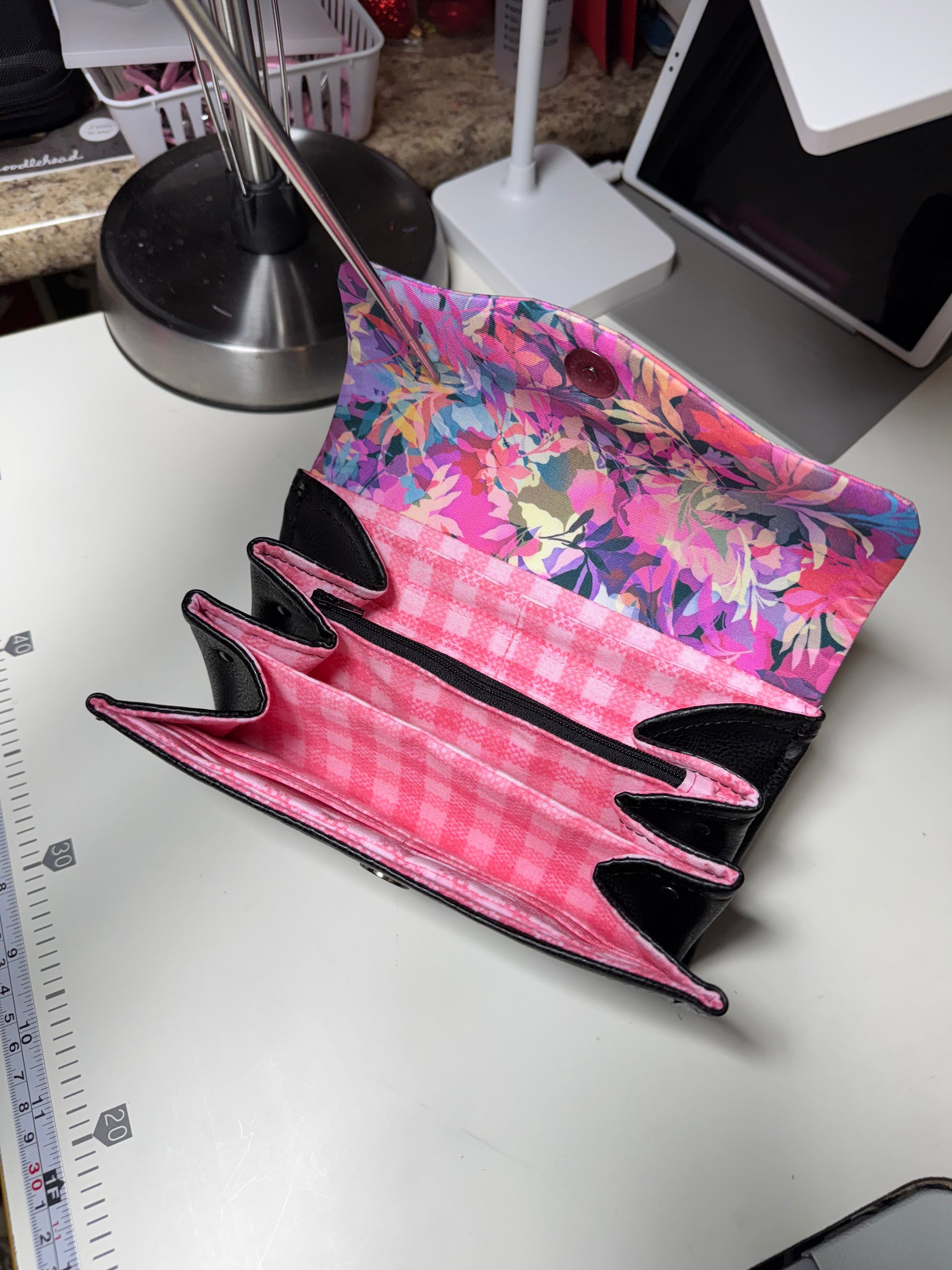 I have 3 available currently that are all the same as the first picture: black vinyl w/the mainly pink leafy print.